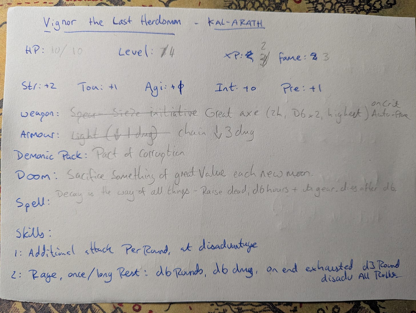 Initiative: (2) Kors goes first.As Kors approaches, Vignor jabs with his spear, raging (4 rounds), he seizes initiative. (5,2)+2=9, hit. (5)+(4) rage dmg, reduced 1. Kors 9/17. Vignor, attacks again, disadv (5,6,6)+2=13 hit. Dmg 3. This damage feels low, I don’t fancy Vignors chances. I’m tempted to save the re-roll for later, another chance at a death save. But, I also think we need to do as much damage as quickly as possible. Vignor won’t survive a drawn out combat.