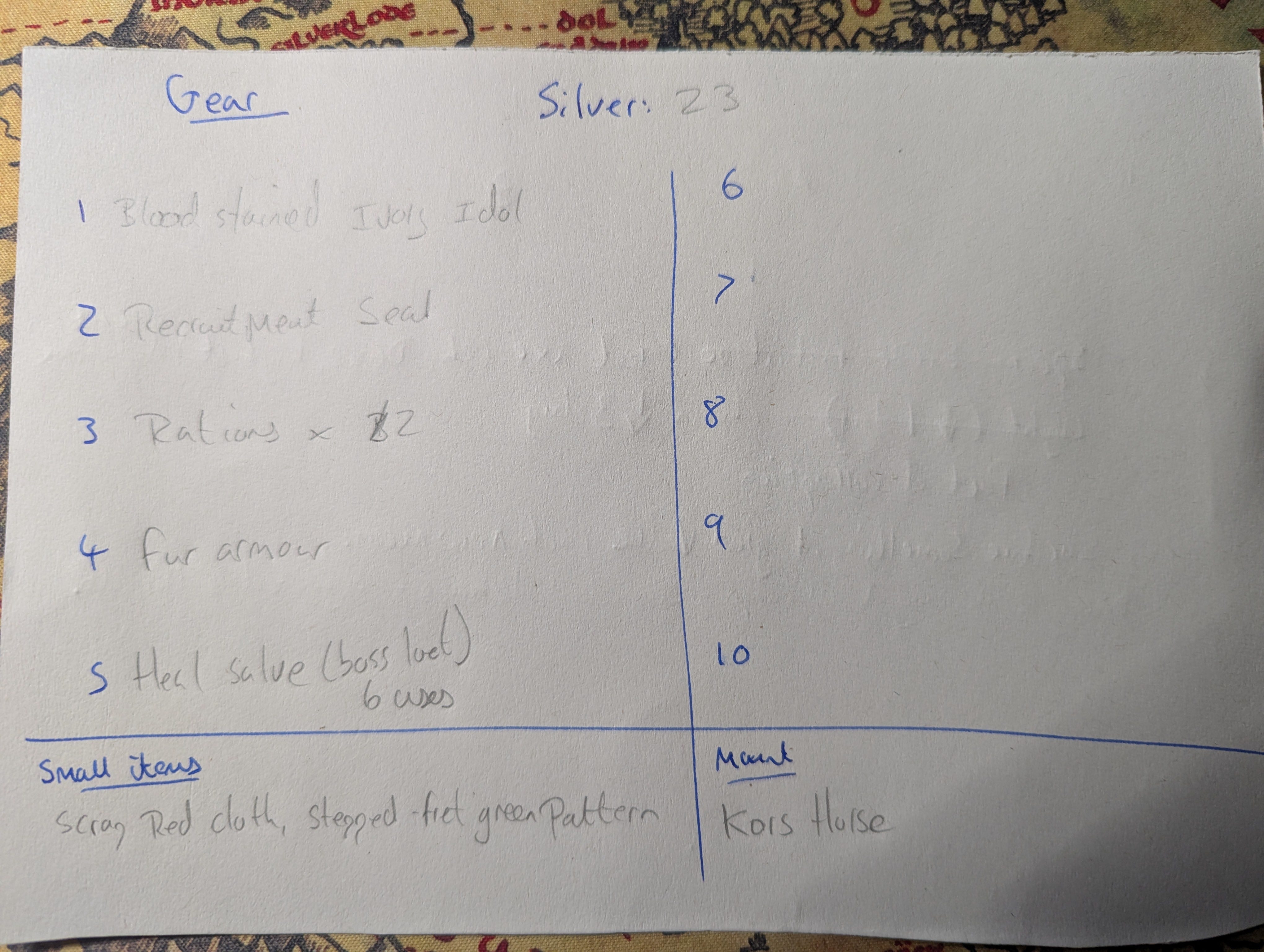 Overall, I’m very happy with how this session turned out. I think I would have enjoyed a session or two more to learn more about the camp, and its denizens. I wasn’t too sure where the campaign was going, but glad the dice gave me some structure to work with.